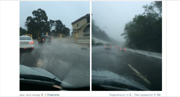 Так, в 12:23 две фотографии залитой дождем улицы распространил пользователь по имени Андрей. "Сочи топит", - добавил он.