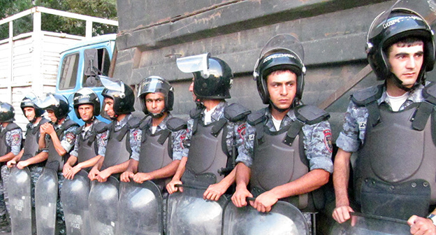 Один человек задержан после столкновения манифестантов и полиции в Ереване. Активисты перекрыли одну из улиц, со стороны захваченного здания полиции прозвучала стрельба, сообщает с места событий корреспондент "Кавказского узла".