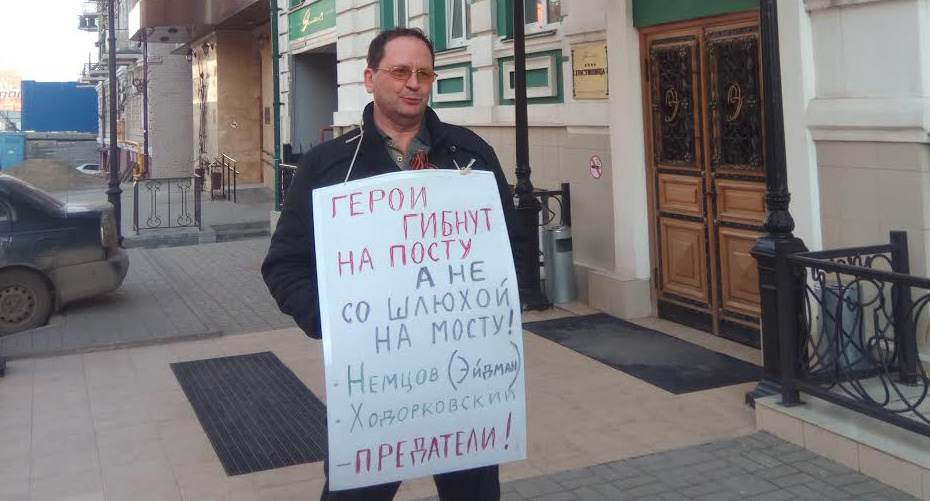 Активисты "Национально-освободительного движения" проводят серию одиночных пикетов напротив гостиницы в Ростове-на-Дону, где проходит бесплатный показ фильма "Немцов".