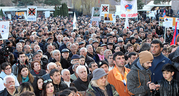 Демонстранты держат в руках плакаты и транспаранты с названиями городов, откуда они приехали принять участие в мероприятии, а также лозунги с требованием отставки руководства страны, "ухода с политической арены правящей Республиканской партии Армении" и освобождения бывшего министра обороны Нагорного Карабаха Самвела Бабаяна.