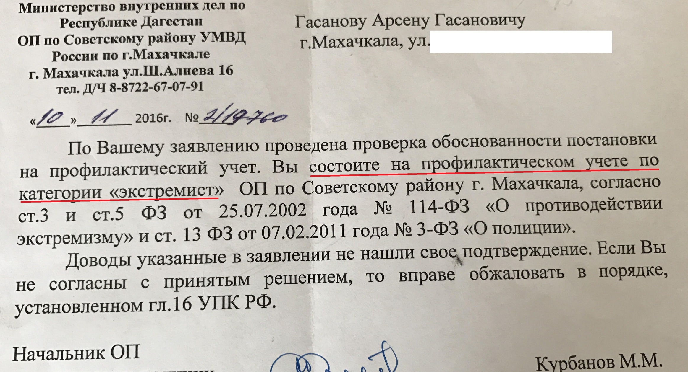 Копия ответа начальника отдела полиции по Советскому району на запрос адвокатов Гасанова имеется в распоряжении "Кавказского узла". В документе сообщается, что "по заявлению Гасанова была проведена проверка обоснованности постановки на профилактический учет". "Вы состоите на профилактическом учете по категории "экстремист" ОП по Советскому району г. Махачкала, согласно ст. 3 и ст. 5 ФЗ от 25.07.2002 года №114-ФЗ "О противодействии экстремизму" и ст. 13 ФЗ от 07.02.2011 года № 3-ФЗ "О полиции". Доводы, указанные в заявлении, не нашли своего подтверждения", - говорится в ответе начальника отдела полиции на запрос Гасанова.