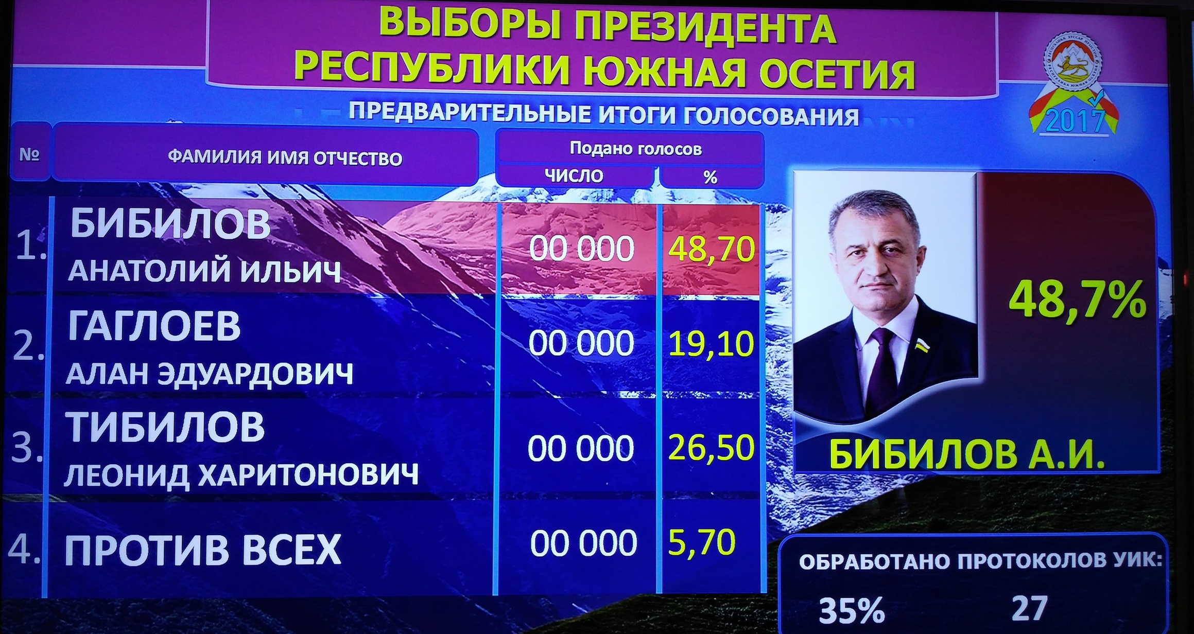 По данным ЦИК Южной Осетии, по итогам обработки бюллетеней с 27 из 77 избирательных участков (35% голосов), лидирует Анатолий Бибилов, который набрал 48,7% голосов. На втором месте находится действующий президент Леонид Тибилов с 26,5% голосов. Третий кандидат - Алан Гаглоев набрал 19,10%. 5,7% избирателей проголосовали против всех кандидатов.