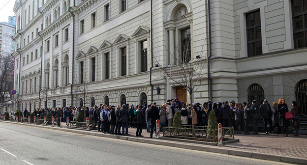 Перед зданием Верховного суда России в Москве сегодня, где продолжаются слушания по делу Свидетелей Иеговы, стоят автозаки, дежурят сотрудники полиции. Здесь же находятся, по подсчетам находящегося на месте событий корреспондента "Кавказского узла", около 200 человек из числа сторонников Управленческого центра Свидетелей Иеговы в России, еще порядка 110 человек – в зале заседания.