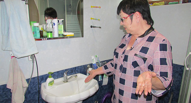 Соседка семьи Дедерко пенсионерка и вдова Нина Скобелева 30 лет живет в поселке Красный Пахарь. Сейчас женщине 75 лет. Живет одна. Нина Скобелева показала корреспонденту "Кавказского узла" свою раковину на кухне – в ней скопился песок, кран протекает.