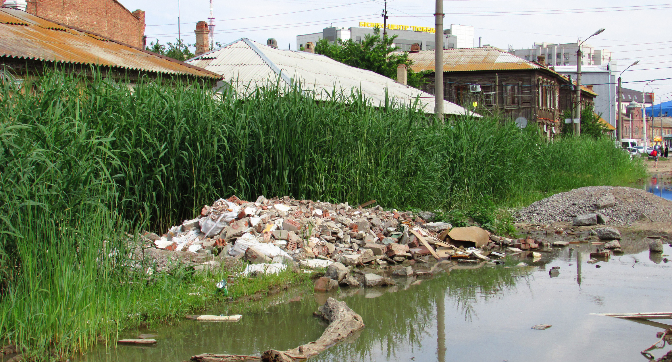 Далее улица Каховского до пересечения с улицей Писарева представляет собой болото, поросшее тростником. Видны кучи бытового и строительного мусора. В зеленой воде плавают головастики, слышно кваканье лягушек. Кое-где из воды торчат канализационные колодцы, некоторые из них открытые и прикрыты лишь досками.