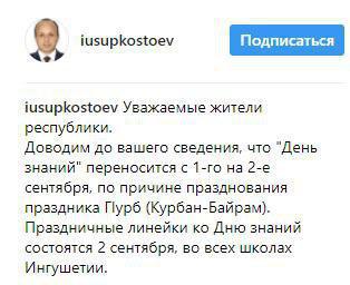 "День знаний переносится с 1-го на 2-е сентября по причине празднования праздника Гlурб (Курбан-байрам). Праздничные линейки ко Дню знаний состоятся 2 сентября во всех школах Ингушетии", - написал Костоев на своей странице в Instagram.