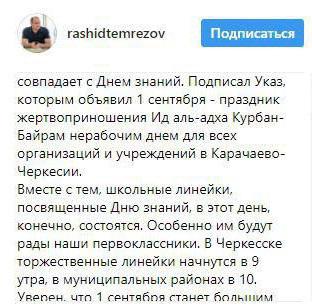 "В этом году один из самых больших и почитаемых у мусульман праздников Курбан-байрам совпадает с Днем знаний. Подписал Указ, которым объявил 1 сентября — праздник жертвоприношений Ид аль-Адха Курбан-Байрам нерабочим днем для всех организаций и учреждений в Карачаево-Черкесии", - сообщил Темрезов на своей странице в Instagram.