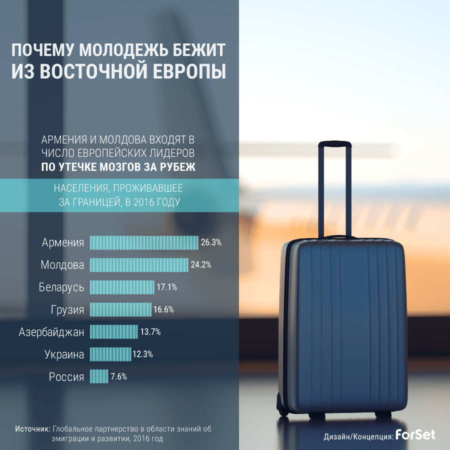 По данным на 2016 год, в эмиграции живет 26,3% населения Армении, 16,6% населения Грузии и 13,7% — Азербайджана. Что касается России, то по сравнению с Закавказьем в пропорциональном отношении отток людей здесь имеет меньший размах. За пределами страны живет только 7,6% россиян 1.