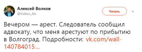Сам Алексей Волков опубликовал сообщение о своем ожидаемом аресте в Twitter. «Вечером — арест. Следователь сообщил адвокату, что меня арестуют по прибытии в Волгоград», - написал Волков.