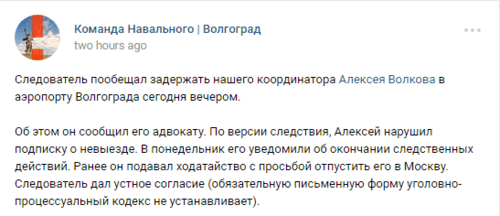 Волков ранее подавал ходатайство с просьбой отпустить его в Москву и «следователь дал устное согласие», поскольку «обязательную письменную форму уголовно-процессуальный кодекс не устанавливает», говорится в сообщении группы «Команда Навального. Волгоград» в социальной сети «ВКонтакте».