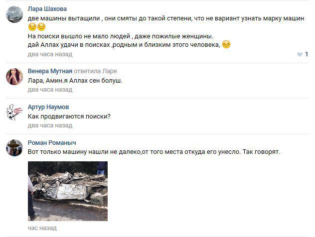 На этой же странице на заданный сегодня вопрос пользователя Артура Наумова о том, как продвигаются поиски, пользователь Роман Романыч ответил: "Вот только машину нашли недалеко от того места, откуда его унесло. Так говорят".