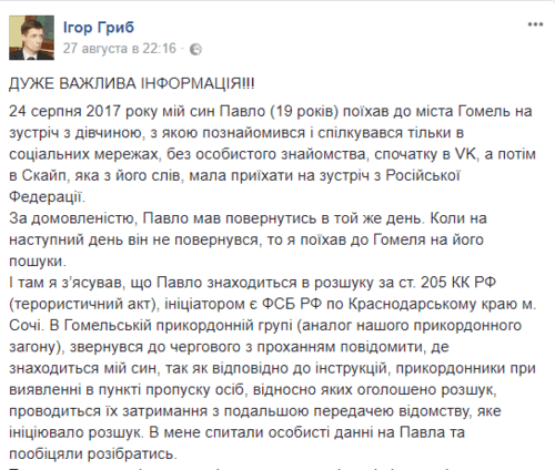 "Девушка, по его [Павла] словам, должна была приехать на встречу из Российской Федерации. Павел должен был вернуться в тот же день. Когда на следующий день он не вернулся, я поехал в Гомель на его поиски. Там я выяснил, что Павел находится в розыске по статье 205 УК РФ (террористический акт). Инициатором является ФСБ по Краснодарскому краю, город Сочи", - написал Игорь Гриб 27 августа на своей странице в Facebook.