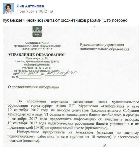 Местные чиновники активно используют административный ресурс, давят на бюджетников, требуя отчитываться об участии в выборах 8. Например, управление образования администрации Анапы почти открыто потребовало от руководителей учреждений допобразования отчитаться о явке на предстоящие выборы.