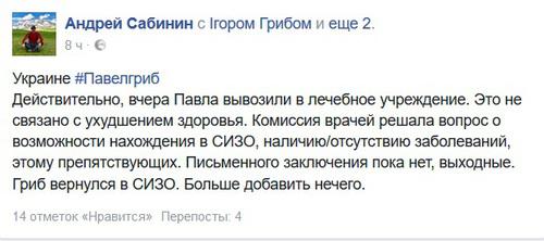 "Комиссия врачей решала вопрос о возможности нахождения в СИЗО, наличию/отсутствию заболеваний, этому препятствующих. Письменного заключения пока нет, выходные", - написал Сабинин на своей странице в Facebook.
