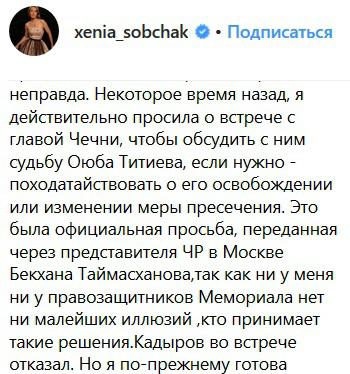 "...невозможно поверить его словам, что он "никогда не слышал о Титиеве". Некоторое время назад, я действительно просила о встрече с главой Чечни, чтобы обсудить с ним судьбу Оюба Титиева, если нужно - походатайствовать о его освобождении или изменении меры пресечения. Это была официальная просьба, переданная через представителя ЧР в Москве Бекхана Таймасханова, так как ни у меня, ни у правозащитников "Мемориала" нет ни малейших иллюзий, кто принимает такие решения. Кадыров во встрече отказал", - написала сегодня в своем аккаунте в социальной сети Instagram Ксения Собчак.