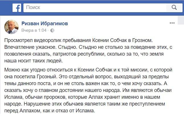 Действия молодых людей, позволивших себе оскорбительные выпады в Грозном в адрес Ксении Собчак, осудил известный чеченский публицист Ризван Ибрагимов. В сентябре 2017 года суд в Грозном приговорил Ибрагимова к двум с половиной годам лишения свободы условно по обвинению в экстремизме. Публицист заявил, что его уголовное преследование инициировано руководством правоохранительных и силовых структур республики.