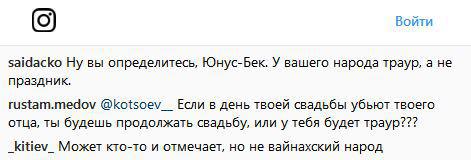 "Ну вы определитесь, Юнус-Бек. У вашего народа траур, а не праздник", - написал в комментарии под постом главы Ингушетии пользователь saidacko.