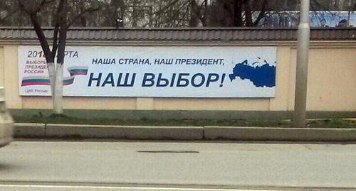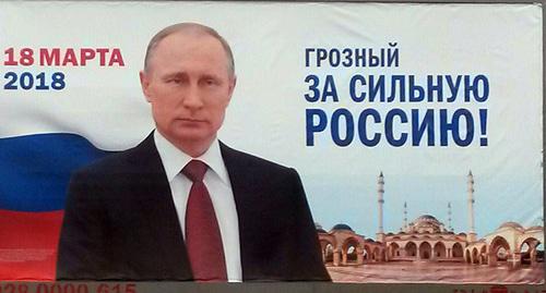 Первые баннеры с изображением Владимира Путина и надписью "Сильный президент – сильная Россия" были вывешены на улицах чеченской столицы еще в январе. Днем 28 февраля часть этих баннеров стали менять на другие баннеры с изображением Путина на фоне российского триколора и мечети "Сердце Чечни" с надписью "Грозный за сильную Россию!". Помимо баннеров с изображением Путина в населенных пунктах республики размещены плакаты и транспаранты с надписями о предстоящих 18 марта выборах президента России.