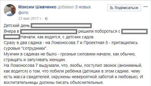 Об одном из подобных визитов силовиков в детсады в мае 2017 года написал на своей странице в Facebook член Совета по правам человека при президенте РФ Максим Шевченко. «Сразу в два садика - на Ломоносова, 7 и Проектная, 8 - притащились суровые "сотрудники". Мужчин в садиках не было - грозные силовики начали, как обычно, стращать и запугивать женщин […] На Ломоносова, 7 выдумали, что, якобы, поступил звонок (анонимный, как водится) о том, что побили ребёнка (детишки в этом садике, чему есть масса свидетелей, окружены невероятной заботой и любовью). И воспитательницы должны писать объяснительные», - написал Максим Шевченко.