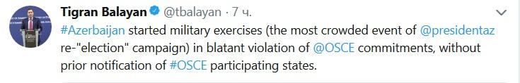"Азербайджан начал военные учения (...) с нарушением обязательств перед Организацией по безопасности и сотрудничеству в Европе, без предварительного уведомления об этом государств-участников ОБСЕ", - цитирует заявление Балаяна, опубликованное на его странице в Twitter, NEWS.am.