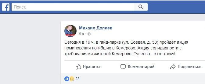 На поминальной акции были заявлены и политические требования. "Акция солидарности с требованиями жителей Кемерово: Тулеева - в отставку!", - написал Долиев на своей странице в Facebook.
