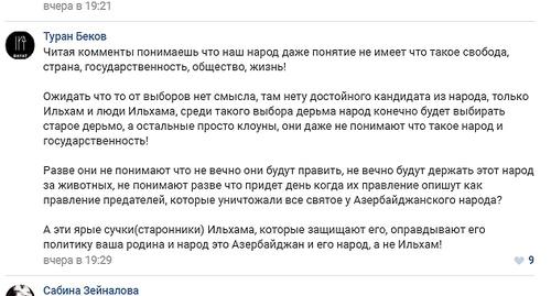 Пользователь Рауф Алиев пишет, что везде "дальше Баку" безработица и "ужас". "Вся молодежь, можно сказать, уехала, те, кто хотят свое дело открыть, им не дают, там реально настоящий бандитизм", - комментирует он ситуацию в стране на фоне выборов президента.