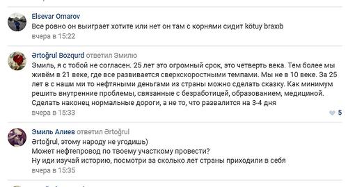 "Ильхам самый лучший президент. При нем Азербайджан развивается. Евроигры, Евровидение. Какой город конфетка стал. Flame Towers - украшение города. В городе много иномарок дорогих. Одежда бакинцев красивая. Деньги у миллятя есть. Ходят в кафе, рестораны. Ильхаму спасибо завтра за это надо сказать, придя на участок, и голос дать", - написал пользователь Теймур Гаджиев.