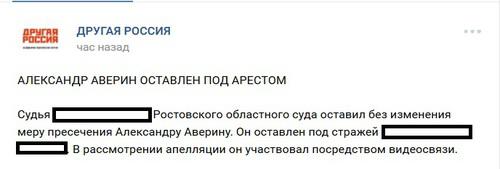 "Судья Ростовского областного суда оставил без изменения меру пресечения Аверину. Он оставлен под стражей. В рассмотрении апелляции он участвовал посредством видеосвязи", - говорится в сообщении в группе "Другой России" в социальной сети "ВКонтакте".