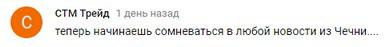 «Тумсо, брат не останавливайся, это приносит пользу», - оставил свой комментарий пользователь под ником ***CIA ***. «Достойный сын своего народа. Приятно смотреть его видео, даже дух поднимает. Тумсо, мы с тобой», - отметил Адам Алиев. «Теперь начинаешь сомневаться в любой новости из Чечни...», - отреагировал СТМ Трейд.