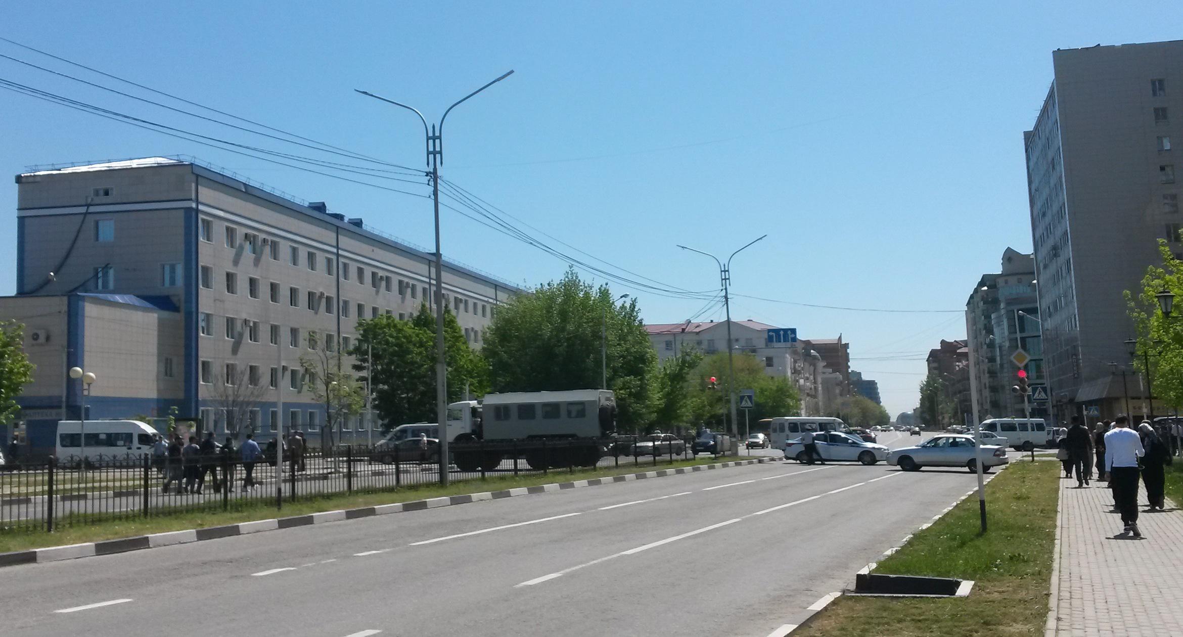 Сегодня в Грозном силовики перекрыли центральные улицы, а также примыкающие ним кварталы в связи с генеральной репетицией парада ко Дню Победы. Скорость движения машин в центре города не превышает 10 километров в час.
