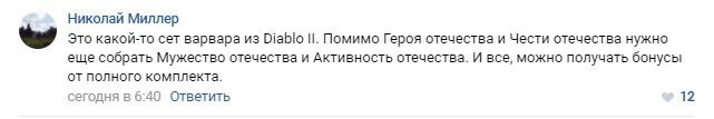 "Это какой-то сет варвара из Diablo II. Помимо Героя отечества и Чести отечества нужно еще собрать Мужество отечества и Активность отечества. И все, можно получать бонусы от полного комплекта", - написал, в частности, в обсуждении новости в соцсети "ВКонтакте" Николай Миллер.