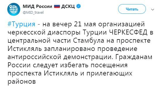 Примечательно, что днем ранее, 20 мая, ситуационно-кризисный центр Министерства иностранных дел России распространил в официальном канале Twitter предупреждение гражданам РФ, находящимся в Турции воздержаться от посещения улицы Истикляль, сообщив, что здесь запланирована антироссийская демонстрация.