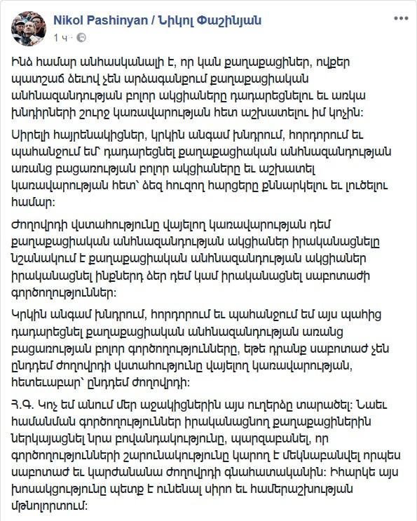 "Дорогие соотечественники, еще раз прошу, призываю и требую прекратить все без исключения акции гражданского неповиновения и сотрудничать с правительством по всем имеющимся проблемам", - написал сегодня Пашинян на своей странице в соцсети Facebook.