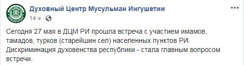 На этой встрече и было решено отрешить главу Ингушетии от мусульманской общины, сообщается 27 мая на странице "Духовного центра мусульман Ингушетии" в соцсети "ВКонтакте".