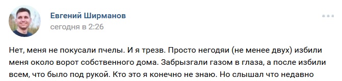 Сегодня ночью блогер опубликовал запись о своем избиении. "Нет, меня не покусали пчелы. И я трезв. Просто негодяи (не менее двух) избили меня около ворот собственного дома. Забрызгали газом в глаза, а после избили всем, что было под рукой", - написал блогер Евгений Ширманов на своей странице "ВКонтакте".