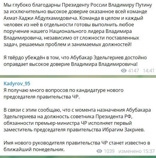 В свою очередь глава Чечни Рамзан Кадыров поздравил Абубакара Эдельгериева с назначением на должность советника президента России. Эдельгериев имеет большой опыт работы на высших должностях в Чечне, заявил в своем Telegram-канале Рамзан Кадыров.