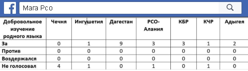 Пользователь Facebook под ником Мага Рсо на своей странице в социальной сети 20 июня опубликовал таблицу с результатами голосования за законопроект о добровольном изучении родных языков представителями республик Северного Кавказа.