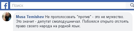 "Не проголосовать "против" - это не мужество. Это значит - депутат смалодушничал. Побоялся открыто отстоять право своего народа на родной язык", - написал пользователь Musa Temishev.