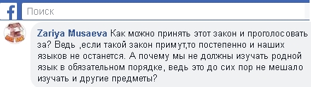 "Как можно принять этот закон и проголосовать "за"? Ведь если такой закон примут, то постепенно и наших языков не останется. А почему мы не должны изучать родной язык в обязательном порядке, ведь это до сих пор не мешало изучать и другие предметы?" - задает вопрос Zariya Musaeva.