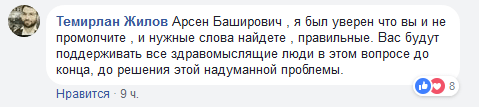 "Арсен Баширович, я был уверен, что вы и не промолчите, и нужные слова найдете, правильные. Вас будут поддерживать все здравомыслящие люди в этом вопросе до конца, до решения этой надуманной проблемы", - написал Темирлан Жилов.