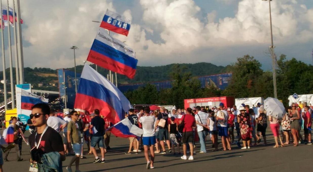 Сегодня, в день последней игры в Сочи с участием российской команды, количество желающих попасть в город-курорт из разных регионов страны возросло. Авиакомпании откликнулись на это существенным повышением цен на билеты. Очевидцы из Сочи сообщают об огромном скоплении болельщиков не только на стадионе и в фан-зоне, но и за их пределами.