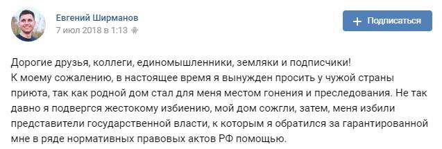 "Не так давно я подвергся жестокому избиению, мой дом сожгли, затем меня избили представители государственной власти, к которым я обратился за гарантированной мне в ряде нормативных правовых актов РФ помощью", - написал 7 июля Евгений Ширманов.