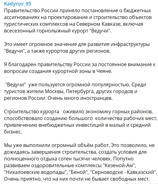 Глава Чечни Рамзан Кадыров прокомментировал принятое правительством России постановление о бюджетных инвестициях на развитие курортов Северного Кавказа, отчитавшись об "огромной популярности" курорта "Ведучи" у российских и иностранных туристов.