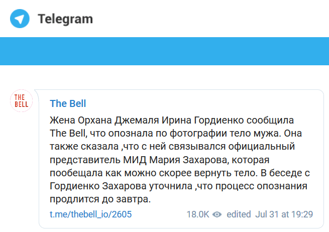 Жена Орхана Джемаля Ирина Гордиенко сообщила, что опознала по фотографии тело мужа, сообщило издание The Bell в своем Telegram-канале.