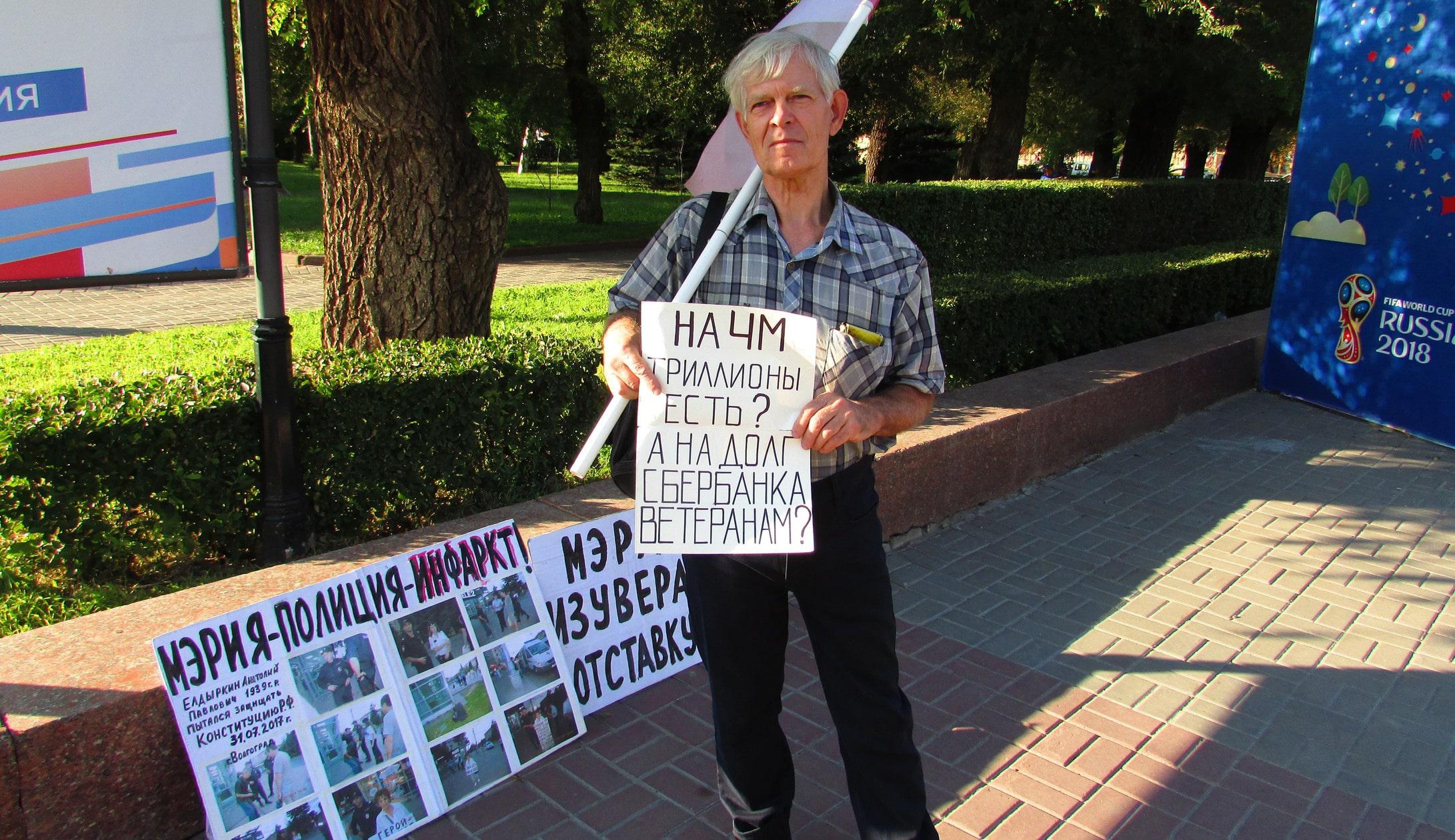 Активист Владимир Васильченко проводил одиночный пикет у площади Павших Борцов. Он держал флаг общества защиты интересов вкладчиков Сбербанка СССР и плакат с фотографиями задержания Анатолия Елдыркина на акции, проходившей 31 июля 2017 года.