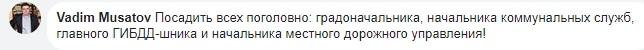 "Посадить всех поголовно: градоначальника, начальника коммунальных служб, главного ГИБДД-шника и начальника местного дорожного управления!" - требует Vadim Musatov.