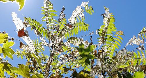 "Я живу на Цветном бульваре в многоквартирном доме. Стала замечать в начале августа нашествие на растения... насекомых, которые объедают листву, превращая ее в пыль... Если в начале августа были объедены только небольшие участки деревьев, то сегодня (11 августа) я обнаружила, что они объедены все или наполовину. От дерева остается паутина. Эта паутина вместе с гусеницами свисает и падает на дорогу. Это ужасное зрелище", - рассказала корреспонденту "Кавказского узла" жительница Сочи, автор сообщения Ева Ильина.