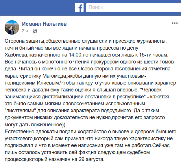 Характеристика, автором которой был назван участковый Илиев, была "особо" отмечена стороной обвинения, заметил Исмаил Нальгиев. "Чтобы так круто участковые описывали характер человека и давали ему такие оценки, я слышал впервые. "Человек, занимающийся дестабилизацией обстановки в республике", - кажется, это было самым мягким словосочетанием, использованным "писателями" для описания характера подсудимого. [...] Естественно, адвокаты подали ходатайство о вызове и допросе бывшего участкового, который сам признал, что никогда такую характеристику не подписывал и в момент ее написания уже там не работал", - написал сегодня Нальгиев на своей странице в Facebook.