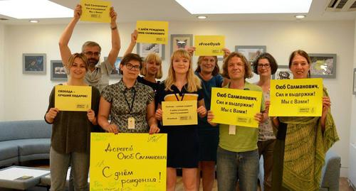 "Родные, друзья, знакомые и просто сочувствующие люди со всей страны и со всего мира поздравляют Оюба Титиева с праздником", - сообщил сегодня правозащитный центр "Мемориал" в своем Telegram-канале, разместив фотографии участников акции в поддержку Титиева.