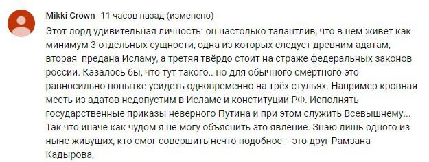 "Этот Лорд удивительная личность: он настолько талантлив, что в нем живет как минимум три отдельных сущности, одна из которых следует древним адатам, вторая предана Исламу, а третья твёрдо стоит на страже федеральных законов России. Казалось бы, что тут такого... Но для обычного смертного это равносильно попытке усидеть одновременно на трёх стульях. Например, кровная месть из адатов недопустим в Исламе и конституции РФ. Исполнять государственные приказы неверного Путина и при этом служить Всевышнему... Так что иначе как чудом я не могу объяснить это явление", - пишет Mikki Crown.